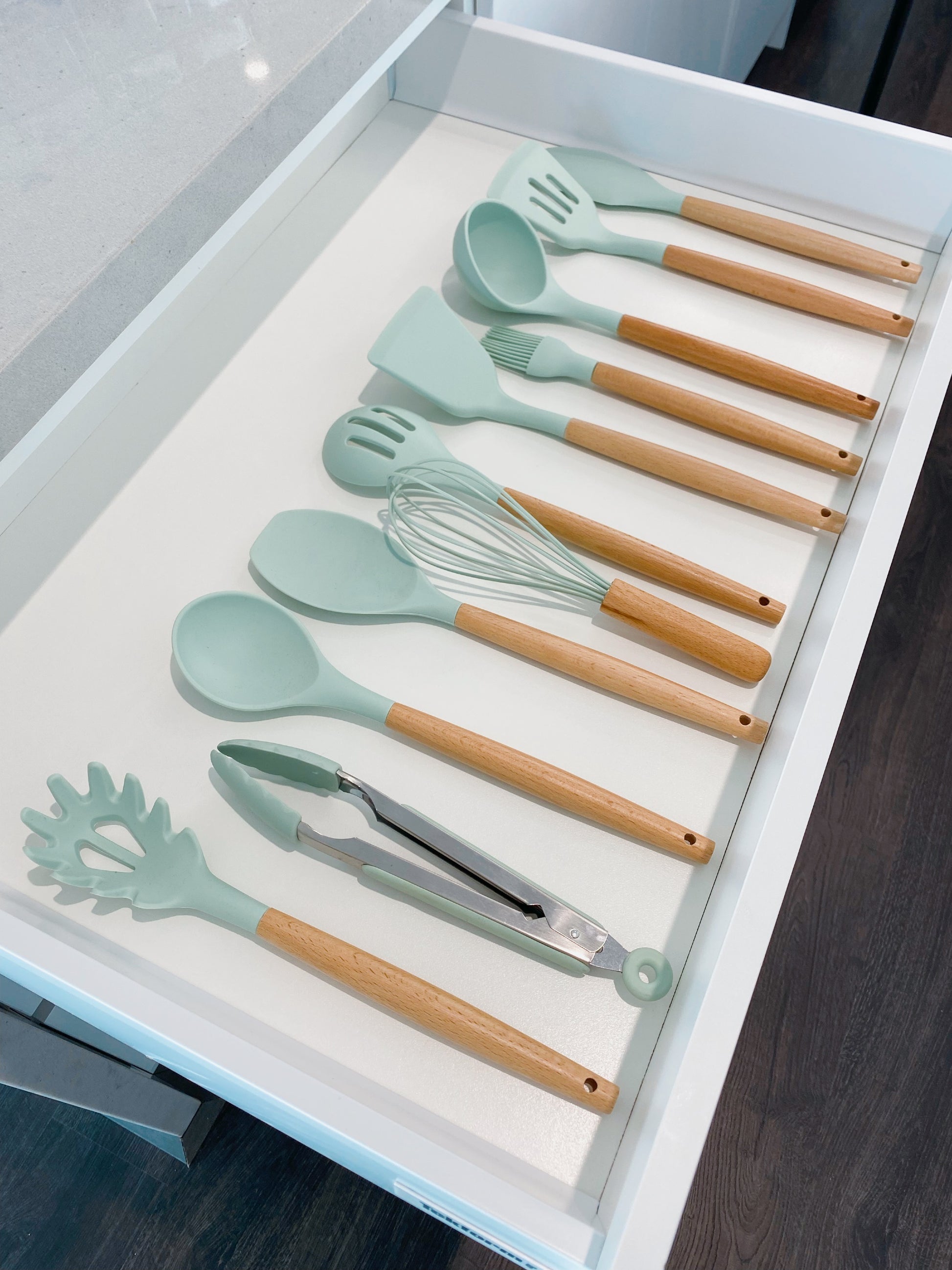 This stunning 12 piece value set will brighten up your whole kitchen and make cooking enjoyable again! These food-safe, non-toxic, non-scratch utensils are very practical for day to day cooking, with high heat resistant silicone, withstanding up to 240 degrees Celsius. They also make for stunning benchtop or pantry décor. If that wasn't enough, Order now to get a Free Bonus Utensil Holder that matches your set!