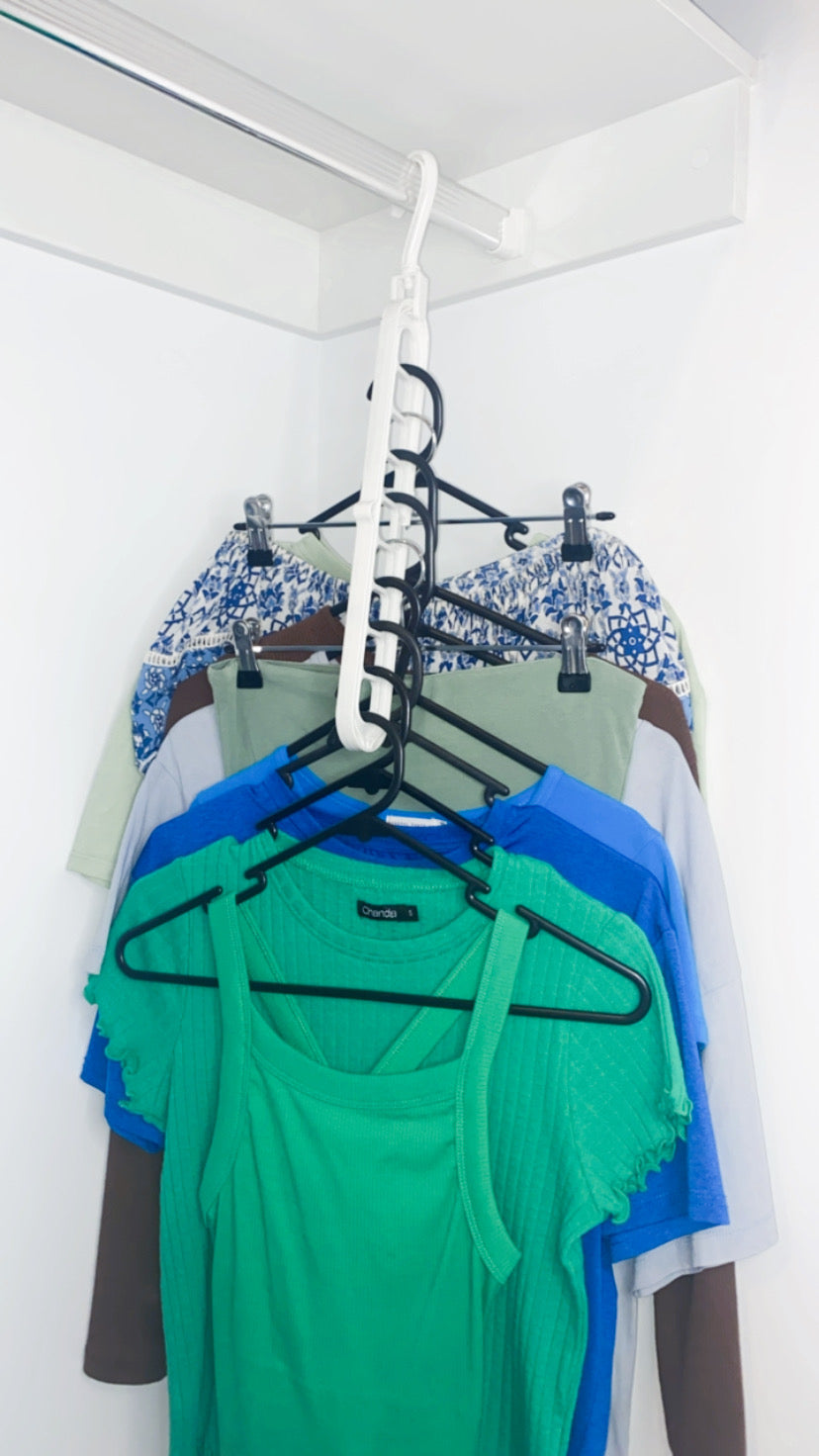 Keep your wardrobe organised with this smart storage device. This custom hanger can store lots of clothes in a more functional & space-saving way.